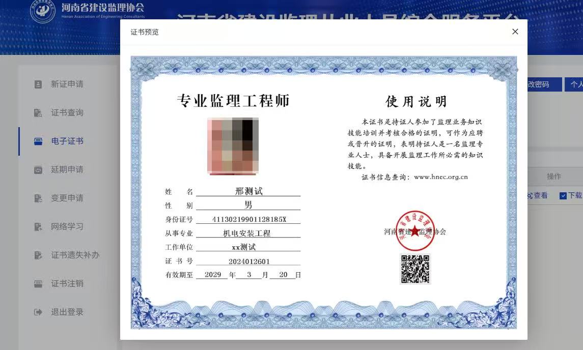 一、自2026年4月1日起,协会培训的专业监理工程师和监理员启用电子证书(样式见附件),需要纸质证书的单位和个人可向协会申请,纸质证书仅记录证书号、姓名、性别、身份证号等固定信息,注册专业、工作单位、有效期等动态信息以电子证书为准。