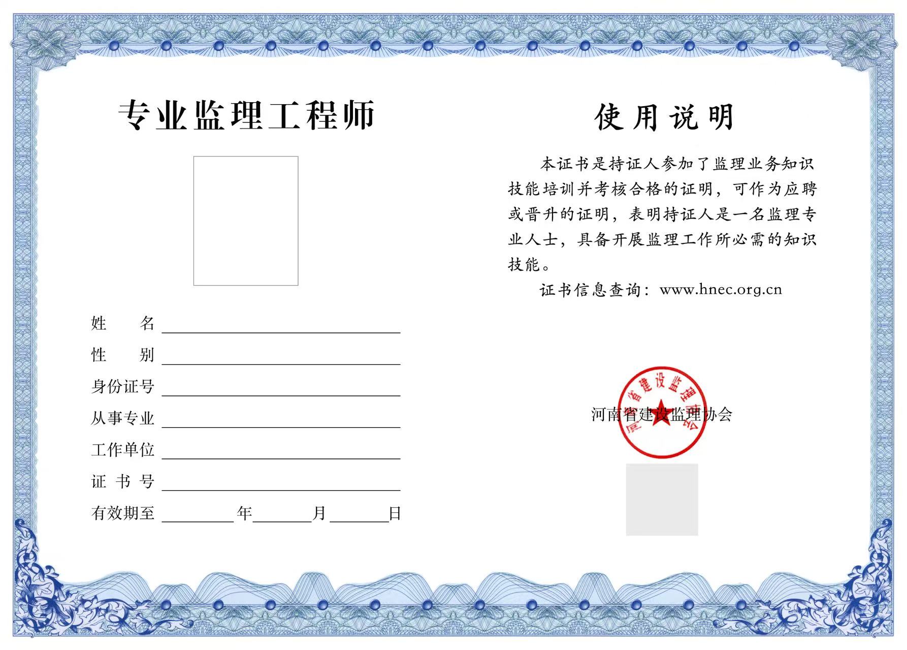一、河南省专业监理工程师样式